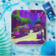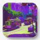 Farbenfrohe Grafik einer Straßenszene in San Francisco mit Seilbahnen...