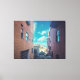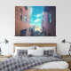 Eine schmale Gasse in San Francisco, Kalifornien, gerahmt von zwei Gebäude mit Kontrastfarben. Das Gebäude auf dem links ist ein warmes, sandiges Beige, während das Gebäude rechts ein cooles, staubiges Rosa ist. Die Gasse schwebt nach unten und lässt einen Blick auf die Bucht und einen abgelegenen Hügel im Hintergrund schweifen.