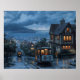 Erleben Sie den Charme San Franciscos in der Dämmerung mit diesem launischen Poster. Zwei Luftseilbahnen gleiten in eine regenverschlungene Straße, flankiert von Viktorianischen Häusern mit leuchtenden Fenstern, während Alcatraz unter dramatischen Wolken über die Bucht schwebt. Ideal für Stadtkunstliebhaber, Stadtbewohner und als einmalige Wohngestaltung oder Geschenk.