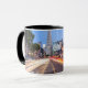 Der Verkehr, der mit unscharfer Bewegung gefangen genommen wurde, überquerte nachts die Columbus Avenue in North Beach in San Francisco. Die Allee führt zum Finanzviertel.