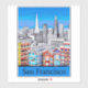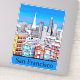 Aufkleber in einer Illustration der Stadt San Francisco, in hellen Primärfarben gepaart mit Schwarz-Weiß-Kunst