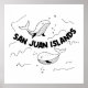 Einfaches Karikaturendesign mit Wales, Blasen und Wellen und "San Juan Islands" in fett geschriebenem Text.