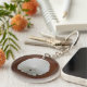 Foto von einem Sand Dollar auf braunem Lederhintergrund. Auf beiden Seiten bedrucktes Design.