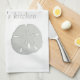 Sanddollartuch - setzen Sie Themaküchentuch mit hübschen Sanddollar und personalisierten Namenseinem schablonenbereich, der in einem Schriftart des silbernen Graus gezeigt wird auf den Strand.