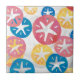 Trendy Sand Dollar Seamless Pattern in Gelb, Rot und Blau zeigt unser originelles Design von verschiedenen Größen und Farben überlappenden Sand Dollars in einem flachen grafischen Stil mit unserer Signatur Textur auf einem texturierten weißen Hintergrund.