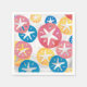 Trendy Sand Dollar Seamless Pattern in Gelb, Rot und Blau zeigt unser originelles Design von verschiedenen Größen und Farben überlappenden Sand Dollars in einem flachen grafischen Stil mit unserer Signatur Textur auf einem texturierten weißen Hintergrund.