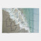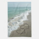 Romantische und nostalgische, ineinander greifende Herzen, die im Sand am Strand gezeichnet werden. Weißer Sand und klares Blau mit weißem Wasser. Ein schönes Geschenk für Valentinstage oder einfach nur ein Strand oder Küstendekor.