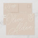 Diese elegante, typografische UAWG-Postkarte wurde speziell für die Einladungen von Script Watermark entworfen und eignet sich hervorragend für herkömmliche Mailing-in-RSVPs. Das Design zeichnet sich durch überdimensionale Schriftzeichen an der Spitze aus, in Ton auf Tontönen für einen Wasserzeichen-Effekt. Personalisieren Sie mit Ihrem gewünschten UAWG und lassen Sie den Wortlaut in klassischen Serifenschrift, rechts unten ausgerichtet, akzeptieren und ablehnen. Unsere Sand-Farbtöne sind eine elegante Mischung aus Erdtönen, mit heller Creme und Terracotta-Tonbuchstaben auf sanftem beigen Hintergrund.