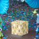Das moderne abstrakte Muster zeigt weiße und graue "Schmuckstücke" auf sandfarbenem Hintergrund