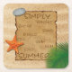 Altes Pergamentpapier mit Palmenblättern, Stein und Seestern auf Strand-Sand Hintergrund. Einfach Sommer: Sonnenuntergang, Küste, Sand, Muscheln, Meer, Schwimmen, Sonne, Surfen.