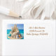 Rücksendeadressen-Aufkleber zum Thema Strand. Sandburg und Muscheln mit blauem Wasser auf einem Sandstrand.