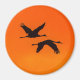 3" runder Magnet mit Bild zweier Sandhiller Krane, die in einen orangen Sonnenuntergang fliegen