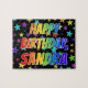 This exciting and vibrant birthday-themed jigsaw puzzle design has the message "HAPPY BIRTHDAY, SANDRA" with the characters having a colorful rainbow spectrum inspirred gradient pattern, along with a lively star shapes background pattern. An exciting puzzle like this might be a fun way to send birthday wishes to somebody named Sandra. [~ Z0000468]