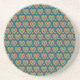 Ein runder Untersetzer aus Sandstein mit kleinen, roten und grünen Herzen auf einem aquamarinen Hintergrund im Stil der "Folk Art".