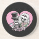 Braut- und Bräutigelschädel sind in ihrer Hochzeitsfeier mit JUST-MARRIED-Text gekleidet.