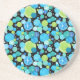 Ein auffälliger, runder Sandstein-Untersetzer mit einem eigenartigen Blau- und Grünkreismuster auf schwarzem Hintergrund. Das Design ist Teil der Posh & Painterly 'Blue Moons' Kollektion und stammt aus einer handbemalten Papiercollage von Judy Adamson.