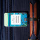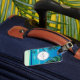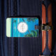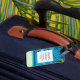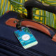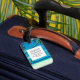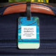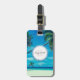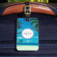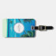 Personalisierter Gepäckanhänger mit einem nautischen Kreis mit Ihrem Namen und der ersten Innenseite. Das Foto ist tropisch gestaltet und besteht aus Kokospalmen, die sich über einen abgelegenen weißen Sandstrand erstrecken. Türkisfarbenes Wasser und ein azurblauer Himmel im Hintergrund.