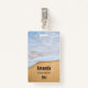 Namensschild mit einem Foto eines goldbraunen Sandstrandes mit weißer, schäumender Brandung.