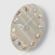 Küste Seashells vereinbarten im Kreis, eine Stunde auf der Uhr jedes Mal zu markieren. Alle verschiedenen Seashells werden rund um die Uhr vereinbart. Die Muscheln stehen auf einem sandigen Strand mit heller Reflexion auf dem Sand still. Es gibt zwölf Seashells, die herum, jedes vereinbart werden, das eine andere Tageszeit markiert. An der Seite gibt es die correspinding Stundenzeiten, die fast im sond, die Zahlen begraben werden, darstellen durch den Sand.