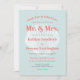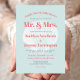 Diese Hochzeitseinladung zum Strand enthält die Worte "Sandy Toes & Salty Kisses", "Mr. & Mrs.," und die Namen der Braut und des Bräutigams in fett rosa Korallentypografie über eine Vintage weiße Abbildung der Jakobsmuschel-Muschel auf einem subtilen aqua-blauen Hintergrund.