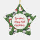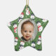 Baby's erstes Weihnachts-Foto-Ornament mit einem lustigen Muster mit niedlichen weißen lächelnden Schneemännern in Lebkuchenroten und dunkel Indigo-blauen Hüten und Schals auf einem hellen Weihnachtsgrün Hintergrund mit gezeichneten Blumen und Stechpalmen. Das Foto und der Text "Brandon's fröhliches erstes Weihnachten!" sind mithilfe der Zazzle-Vorlagenfunktionen vollständig anpassbar. Dieses Design ist Teil der Mellow Snowmen Weihnachts-Kollektion, in der Sie viele passende Schneemann-Produkte wie Karten, Aufkleber, Geschenkpapier, Schleifen, Geschenkanhänger, Kissen, individuelle Weihnachtsstrümpfe und vieles mehr finden. Es gibt auch eine Mellow Snowmen Weihnachtskollektion, die dasselbe Schneemann-Muster in trendigen neutralen Terrakotta-Farben verwendet. Das niedliche Babyjungen-Foto