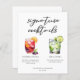 Dieses elegante Cocktails-Menü bietet eine schlichte schwarze Typografie über 2 Drinks und deren Zutaten für Ihre Hochzeitsreise-Bar. Ein niedlicher Sommer Sangria und Gin und Tonic zeichnend fügen einen coolen Flair zu Ihrem Bar Menü. Füllen Sie bitte die Namen des Paares und das Datum für seinen Empfang aus.