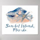 Sanibel Island FL ist einer der großartigsten Orte in den USA für Muschelsammlungen und dieses Plakatprint ist eine Hommage daran, mit seiner Aquarell-Rost- und Blütenhaut-Collage mit handgeschriebenem Schriftart.