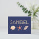 Sanibel Island, Florida besticht durch sein Design mit Aquarellstern und Muscheln und dem Namen Sanibel in einem Deko Schriftart. Der blaue Hintergrund kann nach Belieben in eine andere Farbe geändert werden.