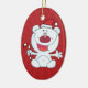 Der niedliche weißes Weihnachtspolare Bär, der eine rote Weihnachtsmannmütze und ein großes Lächeln trägt, hält eine rote und weiße gestreifte Zuckerstange gegen einen roten Sternexplosionhintergrund.