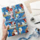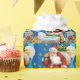 Vintage Weihnachtskartenillustration, die Sankt am Kamin mit einem lächelnden Vollmond im Hintergrund zeigt.