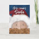 This fun watercolor Santa is eye level with a plate of chocolate chip cookies, looking very interested! This humorous holiday card announcing Santa is coming soon and wishing lots of joy and cookies is perfect for any recipient.