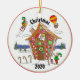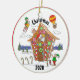 Dieser Weihnachtsschmuck zeigt eine lustige Comic-Illustration des Weihnachtsmannes in einem Lebkuchelhaus mit bunten Süßigkeiten. Beachten Sie den Elf auf der Rakete, einen anderen in einem Heißluftballon, einen nach Santa, und zwei weitere Eis-Skaten auf einem Teich. Schauen Sie naher und sehen Sie, wie Rudolph um die Ecke des Hauses pinkelt. Der Text lautet "Weihnachten" "2020". Du kannst das Jahr ändern, wenn du willst. Original-Kunstwerk. Copyright Leah Wiedemer.