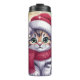 The kitten is prominently featured wearing a classic red Santa hat with a white pom-pom and a chunky, red knitted scarf. The background is a soft blend of evergreen garland, hanging ornaments, and twinkling string lights, creating a magical, snowy, and slightly blurred bokeh effect that brings the kitten into sharp, adorable focus. This portrait perfectly captures the innocent charm and festive spirit of the holiday season, making it ideal for a mug, tumbler, or seasonal card