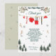 Feiern Sie die Freude eines Winterbabys mit dieser festlichen Santa Baby Baby Shower Danksagungskarte! Entworfen mit Weihnachtsstimmung im Sinn, zeigt sie entzückende Wasserfarbillustrationen von Santas winziger Kleidung, die an einer Wäscheleine hängt, umgeben von Schneeflocken, Tannenbäumen, Zuckerstangen und Weihnachtsgrün.