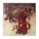 Keramik Tile mit Arthur Rackhams Abbildung Santa Claus (1907). Ein roter, roter Weihnachtsmann trägt eine Tüte Weihnachtsgeschenke in einem schneebedeckten Holz. Elfen fliegen an seiner Seite. Ein fröhliches Geschenk zu Weihnachten!