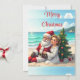 Eine skurrile Urlaubsszene mit dem Weihnachtsmann und einer Frau in einem weißen Kleid, sitzend auf einem Sandstrand. Der Weihnachtsmann lächelt mit seinem ikonischen roten Anzug und dem weißen Bart herzlich an, während er sich an einen verzierten Weihnachtsbaum lehnt.