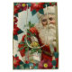 Vintage illustration of Santa Claus bringing gifts and presents for Christmas, decorated with holly berries and poinsettias.