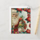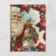 Vintage illustration of Santa Claus bringing gifts and presents for Christmas, decorated with holly berries and poinsettias.