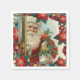 Vintage illustration of Santa Claus bringing gifts and presents for Christmas, decorated with holly berries and poinsettias.