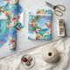 This Surfing Santa Christmas in July Coastal Wrapping Paper features jolly Santa in a Hawaiian floral shirt and red shorts, riding bright turquoise waves under swaying palm trees.
