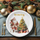 Pretty paper plates with "be merry" in a gold font. Santa Claus stands next to a beautifully decorated tree with wrapped gifts under the tree.