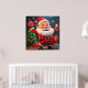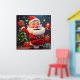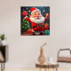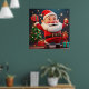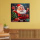 Der Weihnachtsmann hält ein Geschenk und ist von einem geschmückten Weihnachtsbaum umgeben. Die festliche Szene illustriert Feiern, Freude und Urlaubsstimmung.