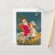 Vintage illustration of Santa Claus on a white wooden horse, carrying a Christmas tree with colorful baubles and a basket full of toys under a clear blue night sky with a bright shining moon and stars on a cold winters night.