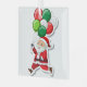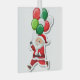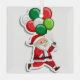 Illustration eines Cartoon Weihnachtsmann, der mit einem Haufen Ballons läuft, die Ballons sind rot, grün und weiß, der Weihnachtsmann ist weiß, etwa 70 Jahre alt, mit weißem Haar und Bart, mit einem roten Anzug mit weißem Pelzschnitt und einem schwarzen Gürtel, die Abbildung ist auf einem weißen quadratischen Ornament mit einem weißen Band oben.