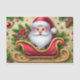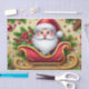 Eine fröhliche Illustration des Weihnachtsmannes in einem roten Schlitten, der mit Feriendekorationen, Ziergegenständen, Pinecones und Heiligen geschmückt ist und eine festliche Weihnachtsatmosphäre schafft.