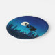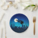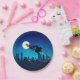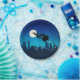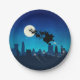 Abbildung des Weihnachtsmanns: Eine Nachtfahrt über die Skyline einer Stadt mit dem Nachthimmel und dem hellen Mond und den Sternen im Hintergrund.