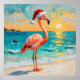 Ein skurriles Porträt eines schlanken Flamingos, seine elegante Form illustriert in sanften, zarten Pinzen und cremig weißen, sanft stehenden, an einem sonnendurchfluteten Strand. Auf dem Kopf steht eine helle, festliche Weihnachtsmannmütze, deren roter Samt und weißes Fell einen auffallenden Kontrast zu den Federn des Vogels bilden. Der Hintergrund verschwimmt sanft in die warmen, goldenen Farbtöne einer untergehenden Sonne, die auf einem ruhigen, flachen türkisfarbenen Wasser reflektiert und mit lockeren, impressionistischen Pinselstrichen illustriert ist, die ein Gefühl von Ruhe und Erholung wecken.