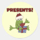 Santa Frog Ferien-T - Shirt, Sweatshirts, Totenbeutel, Karten, Aufkleber, Tasse, Magnete, Schlüsselanhänger, und andere Feiertagskleidung und Geschenke mit einem Frosch in einer Weihnachtsmannmütze, Geschenke und Text, der lautet "Presents!".