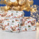 The repeated pattern on this Christmas wrapping paper includes an image of a Golden Retriever dog wearing a red and white Santa Claus hat. Also included in the pattern is a gingerbread man, a red bow, a holly sprig with red berries, and varied sizes of ornate gold snowflakes. Stylized red and green text says MERRY CHRISTMAS" and "HAPPY NEW YEAR". Be sure to see the many other products with dog images (and cats, too!) at Dog Village.