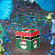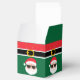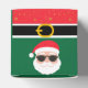 Der Weihnachtsmann sieht sehr cool aus mit Sonnenschein, Set vor einem grünen Hintergrund mit seinem Gürtel oben und einem roten goldenen Sternmuster